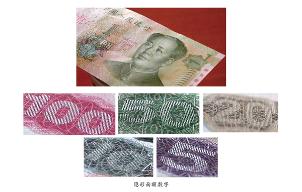 第五套人民币从1元券到100元券的正面右上角面额数字下的团花内隐藏着利用隐形图文技术制作的面额数字。